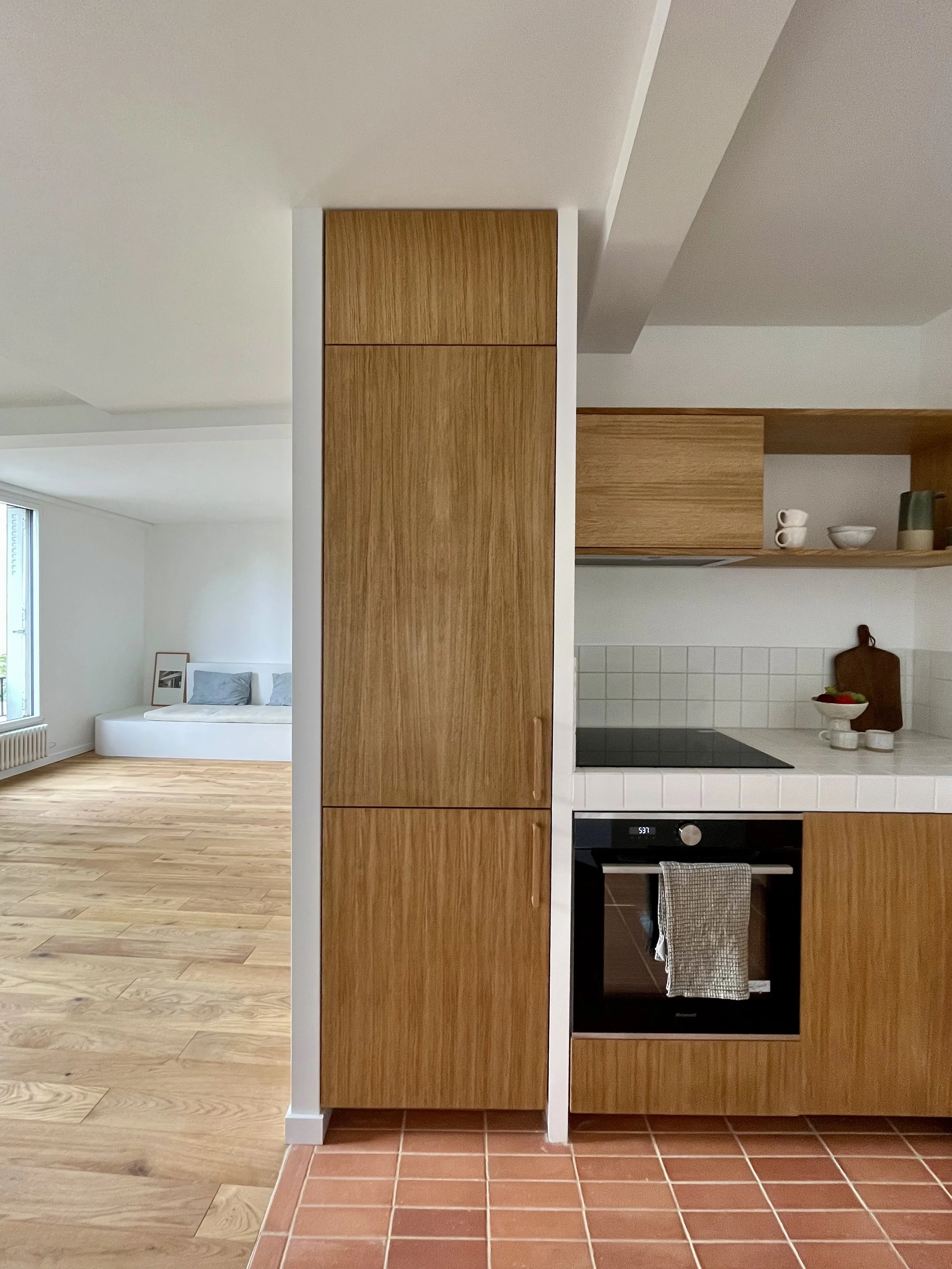 Nature des travaux · Rénovation complète, réagencement du plan d’aménagement, ouvertures de porteurs avec reprises structurelles, dessin de mobilier sur-mesure